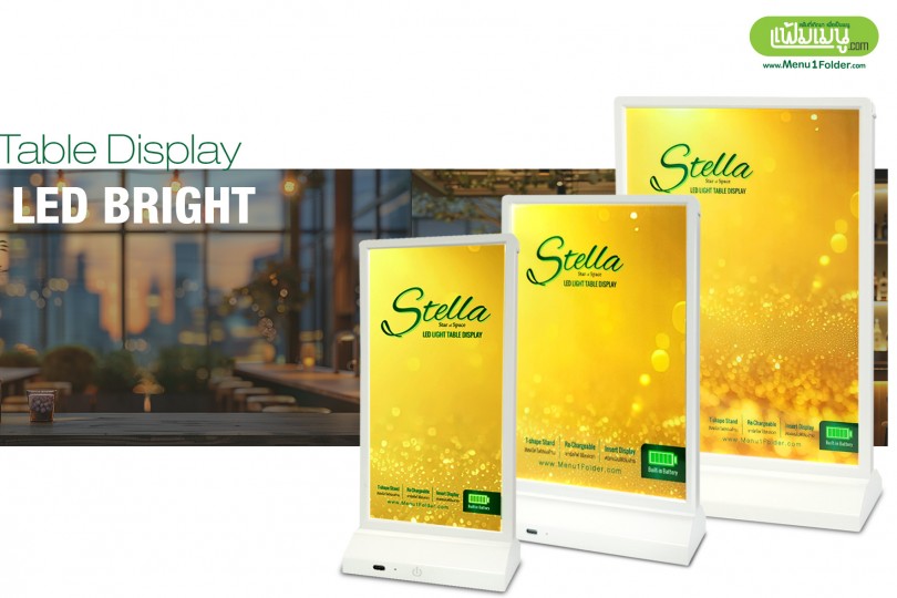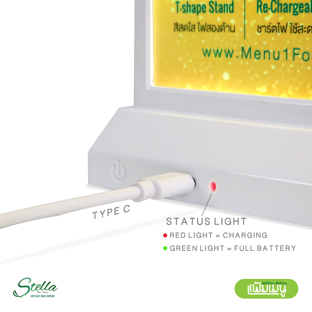 ป้ายไฟ LED ตั้งโต๊ะ รุ่น Stella ออกแบบฐานเป็นทรง T-Shape มีแบตเตอรี่ในตัว ใช้งานได้ยาวนาน พร้อมสายชาร์จ Type-C เหมาะสำหรับร้านค้า คาเฟ่ ร้านอาหาร วางบนโต๊ะ นำเสนอโปรโมชั่นต่างๆ เปลี่ยนแผ่นภายในป้ายได้ ใส่ได้ 2 ด้าน ด้านหน้า-หลัง เพิ่มความสดใส ดึงดูสายตา กระตุ้นยอดขาย มีน้ำหนักเบา จัดเก็บง่าย